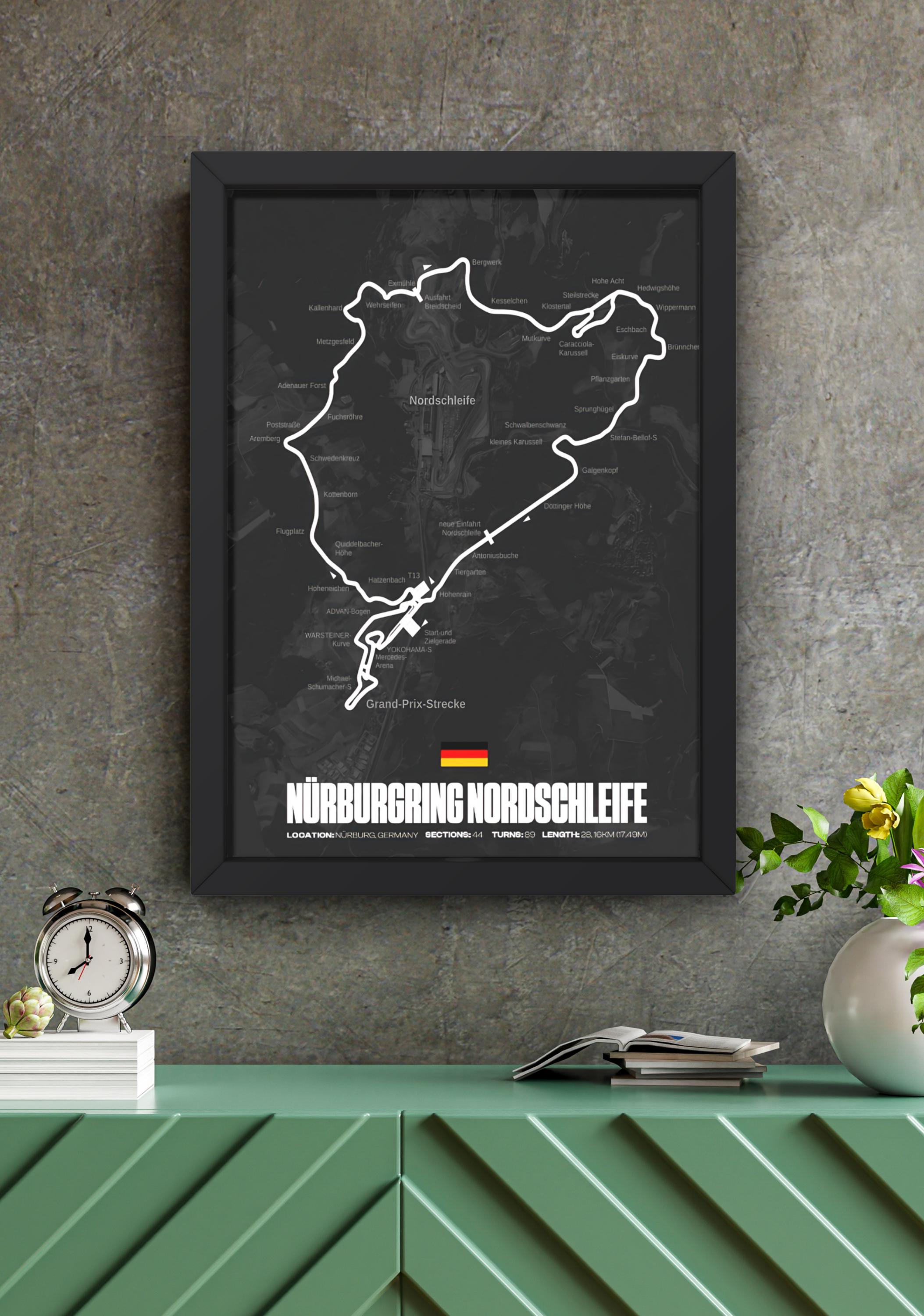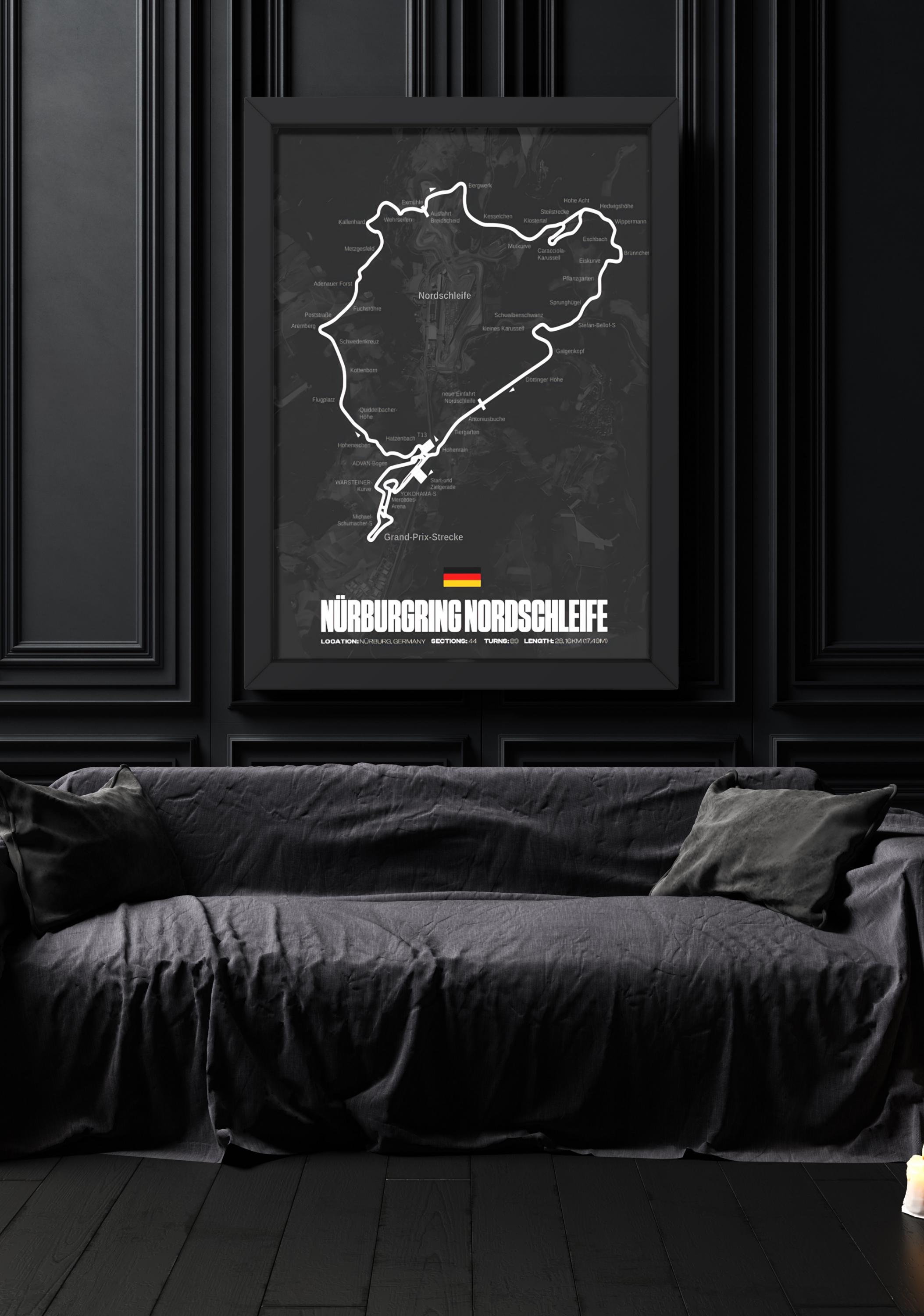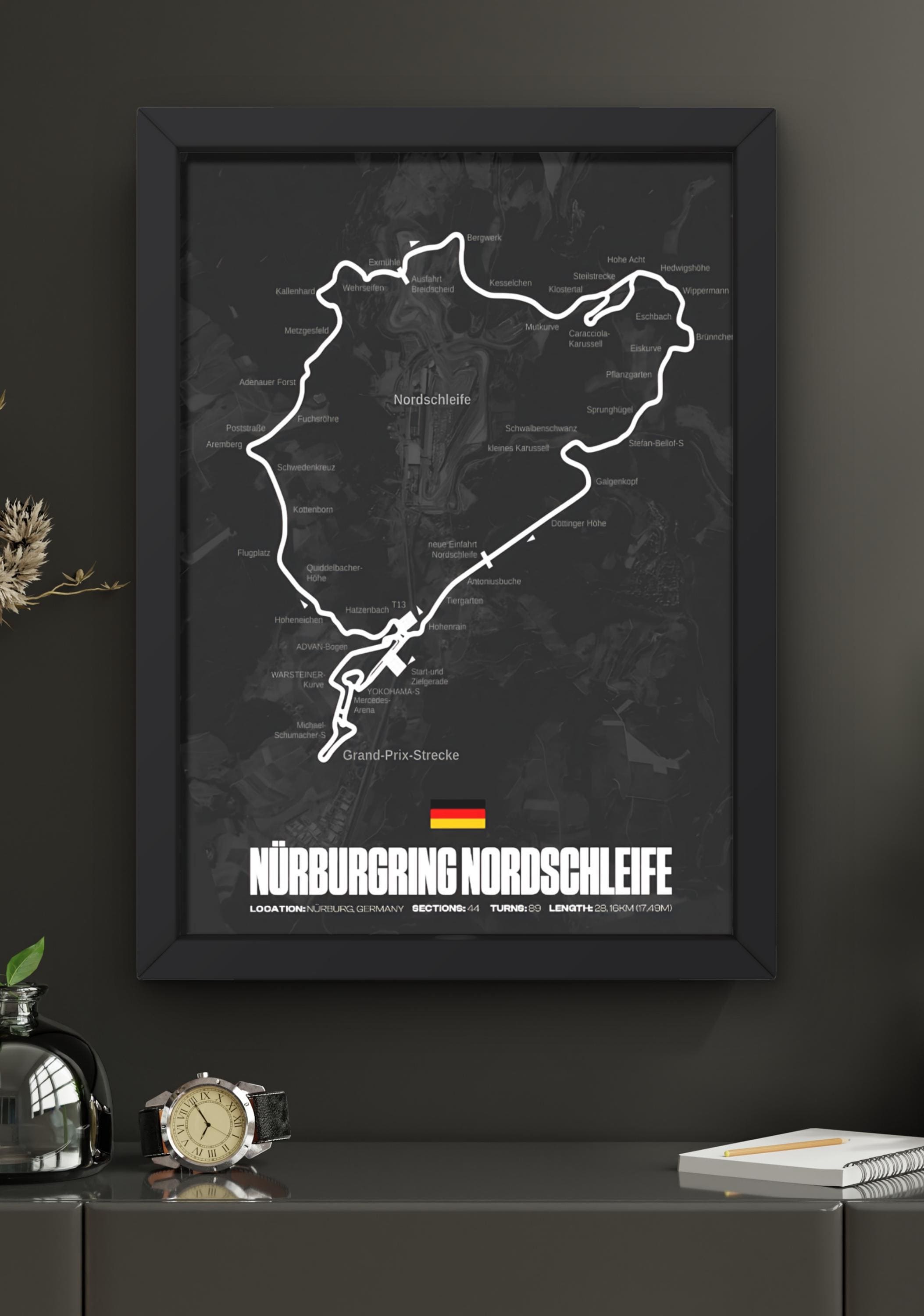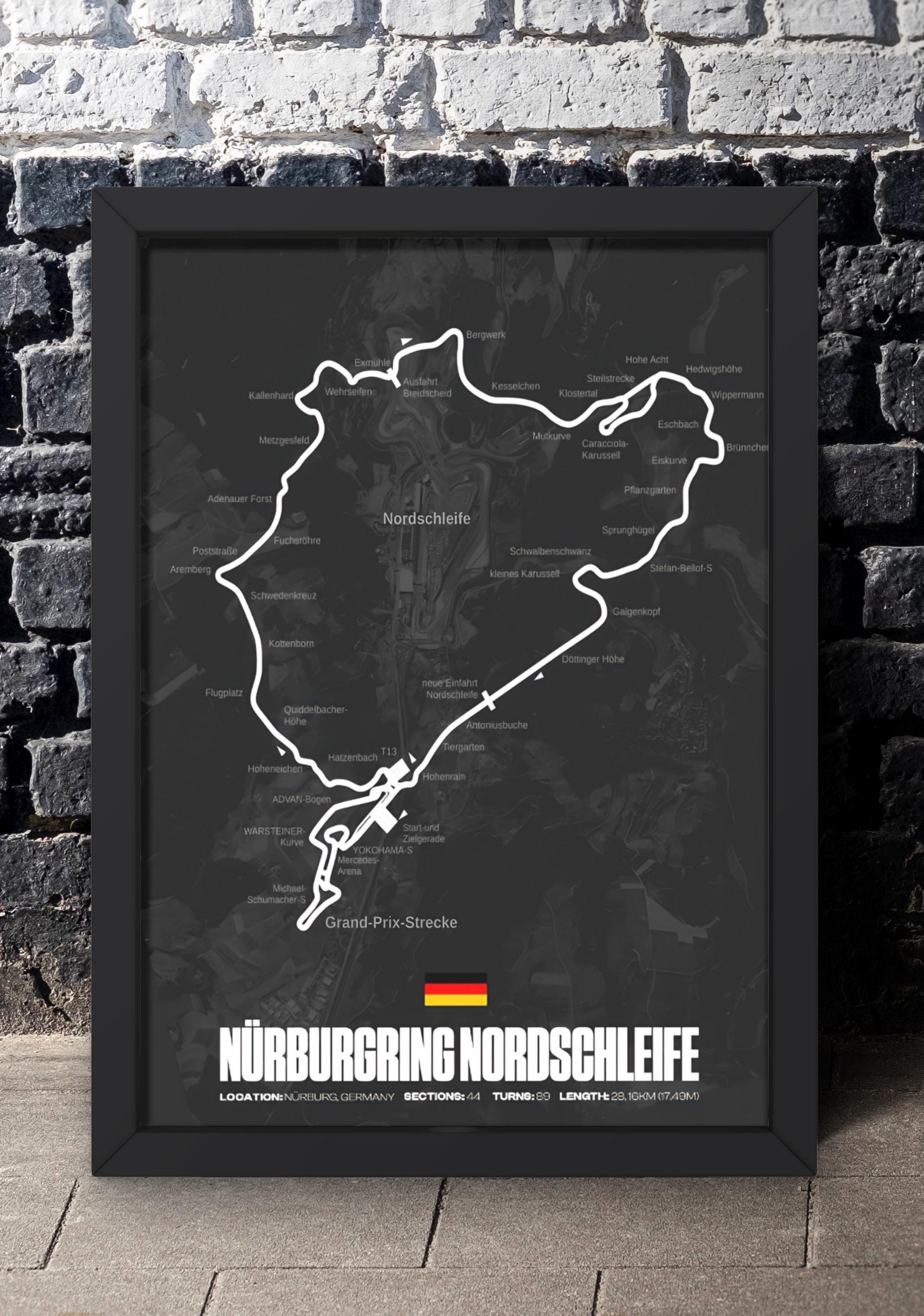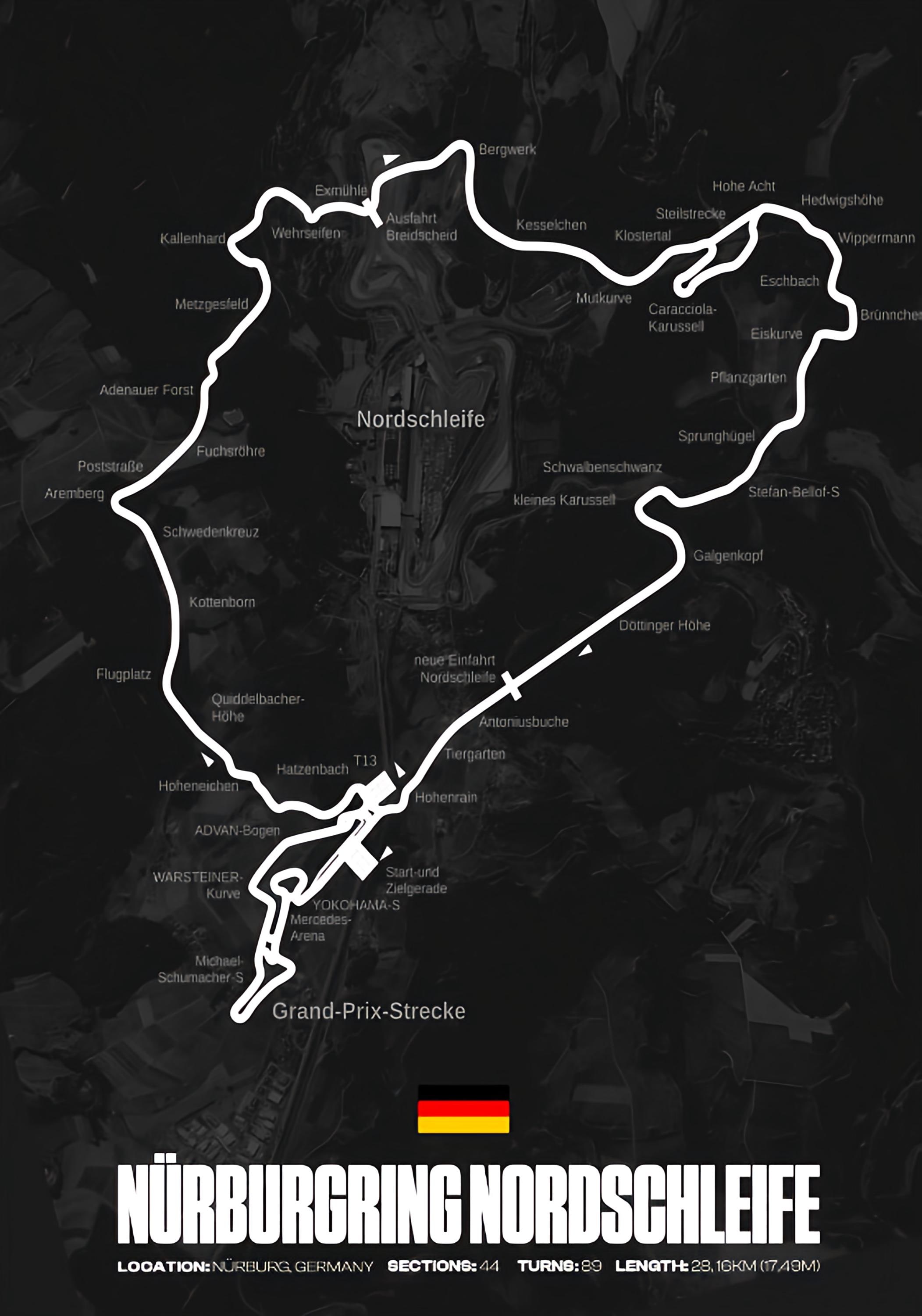 This Nürburgring Nordschleife track map is designed for high-quality printing and is ideal for posters in A1, A2, A3 and A4 sizes. Its modern, minimalist design is perfect for motorsport fans, sim racers and car enthusiasts.